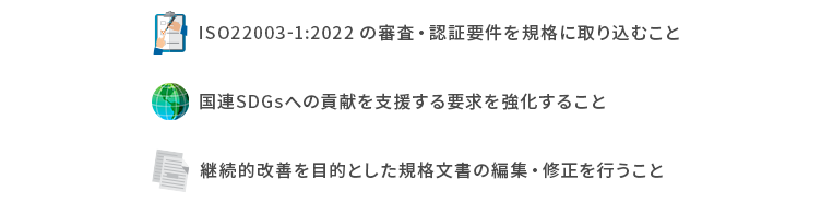FSSC22000の改訂の主な目的は、以下の3つが挙げられています。
