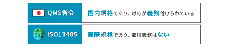 「QMS省令」は、日本国内で医療機器製造業・製造販売業を行う企業に法的に適用される要件であり、これは義務です。一方、「ISO13485」はあくまで国際規格であり、日本国内において取得義務は法的に課されていません。