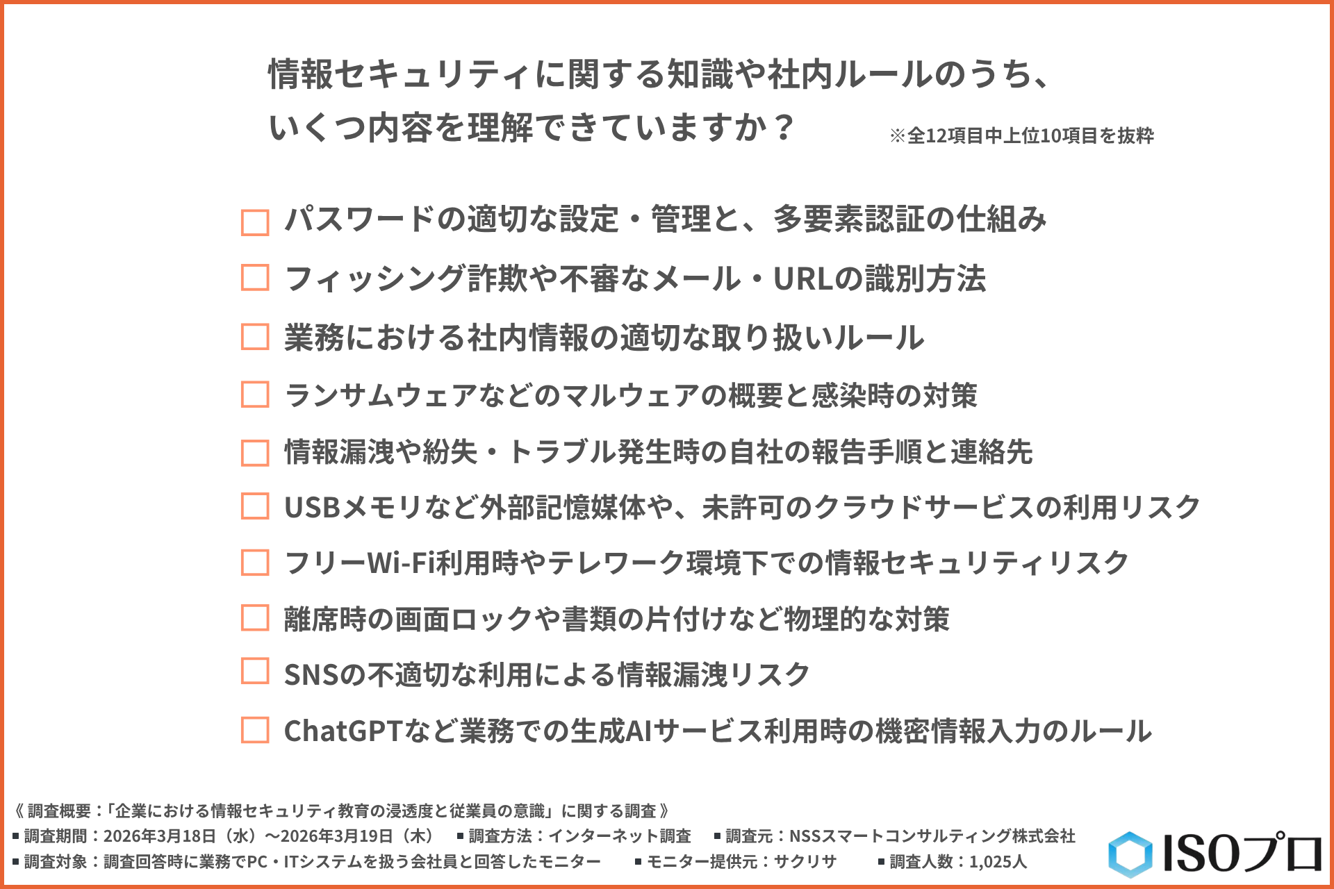 各種ISOの新規取得・運用サポートサイト『ISOプロ』(https://activation-service.jp/iso/)を運営するNSSスマートコンサルティング株式会社は、業務でPC・ITシステムを扱う会社員を対象に、「企業における情報セキュリティ教育の浸透度と従業員の意識」に関する調査を行いました。